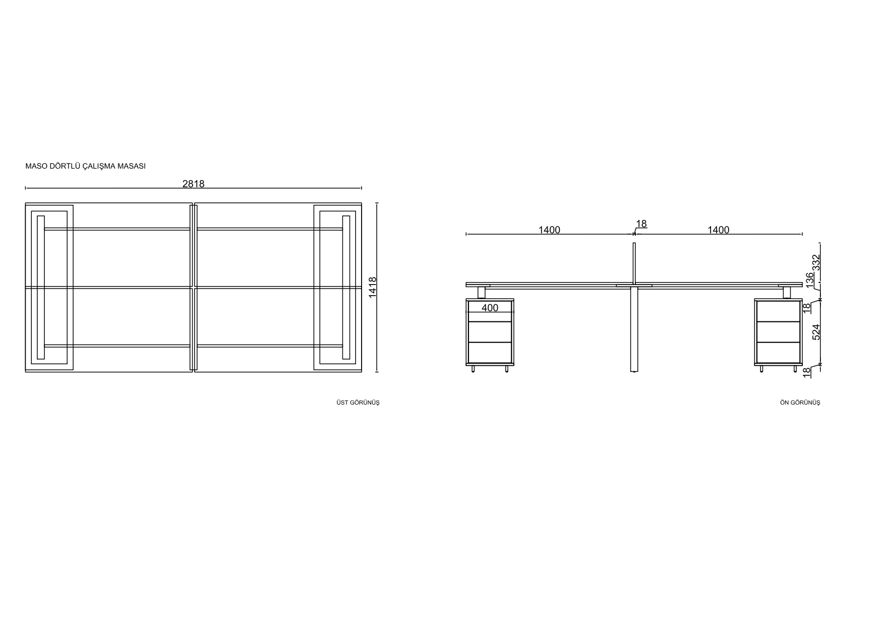 Maso Dörtlü Çalışma Masası: Boy:280 cm En: 140 cm Yükseklik:75 cm