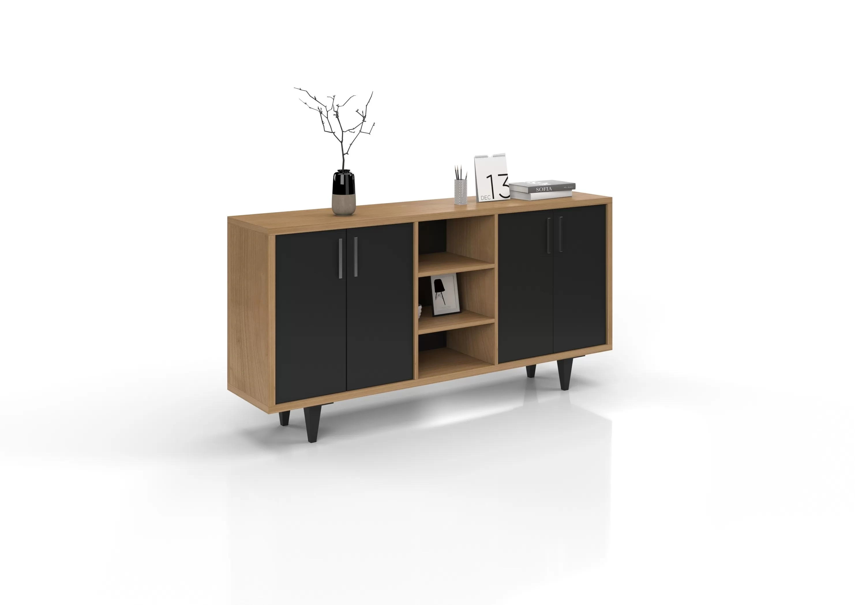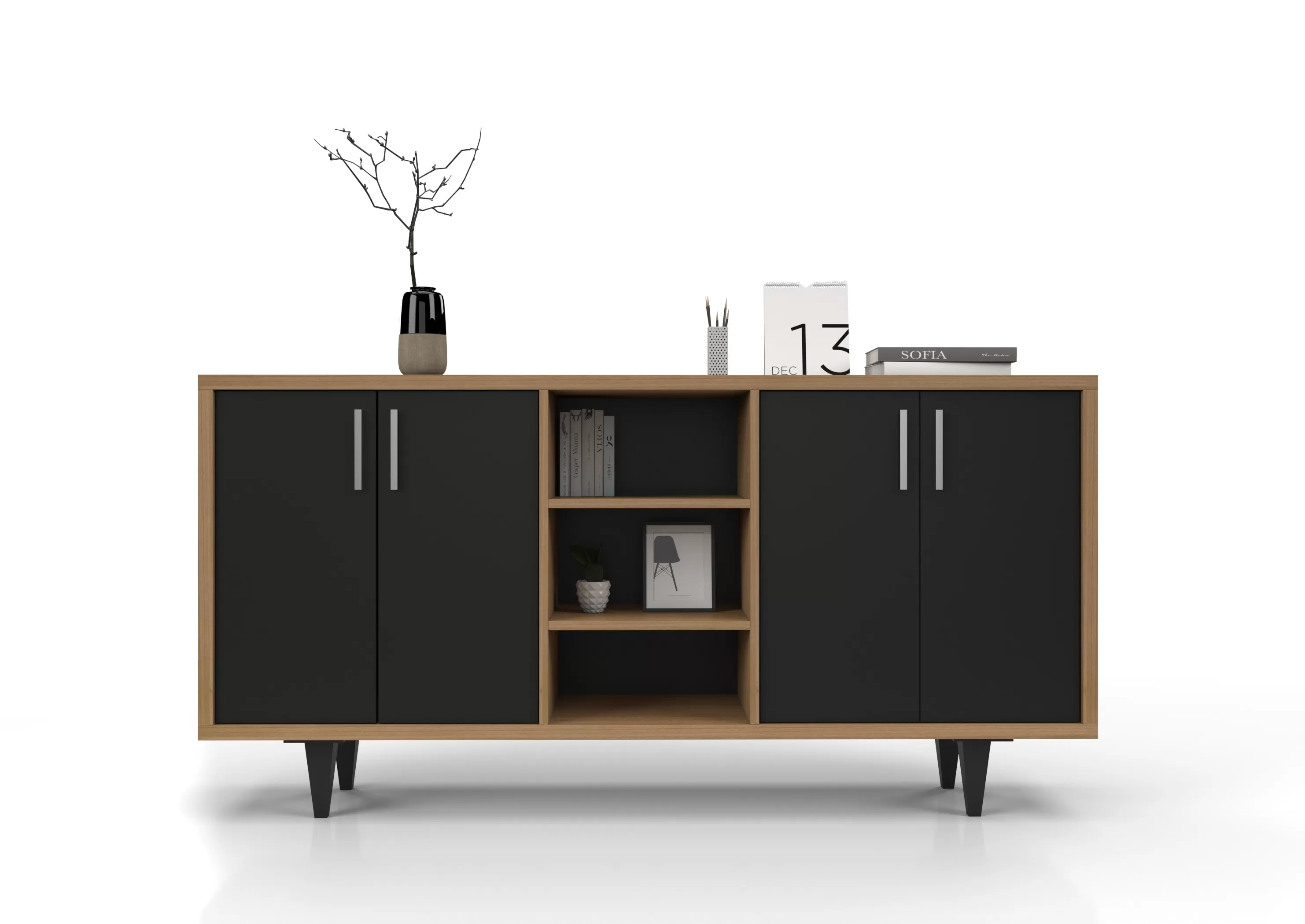 Şık siyah kapakları ve doğal ahşap yüzeyiyle Novella Dolap, modern depolama çözümünüz!
