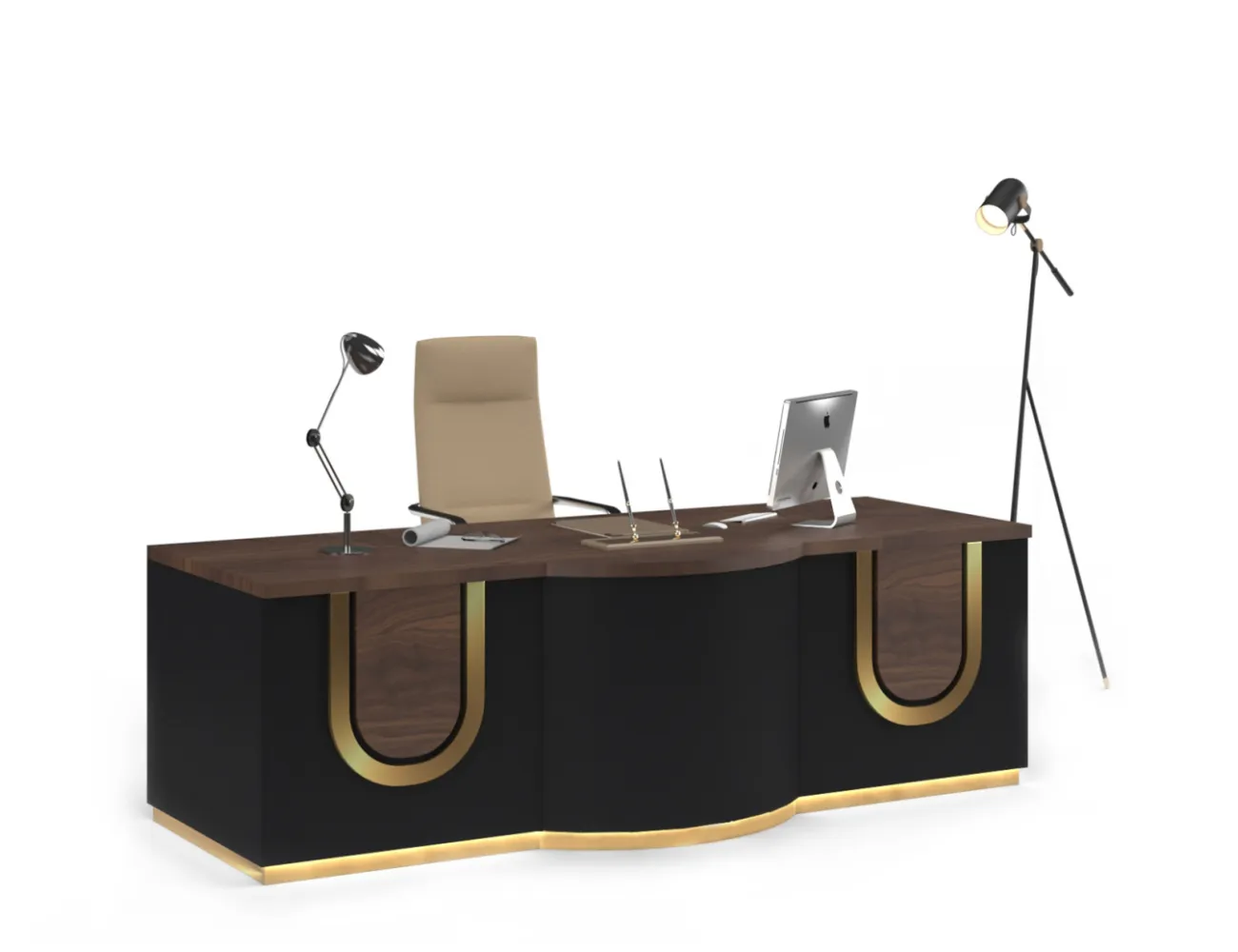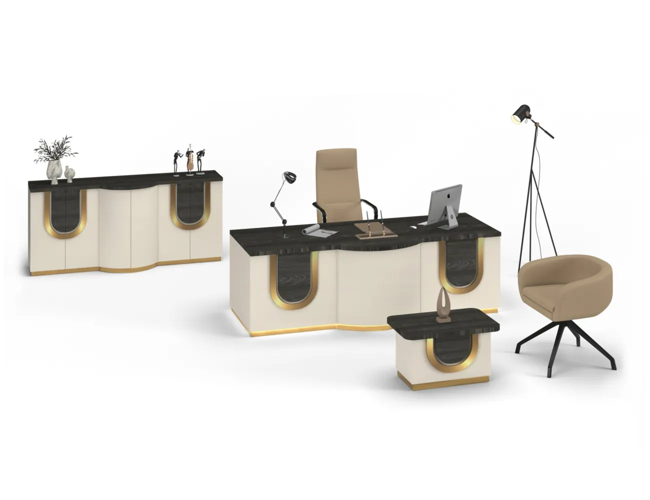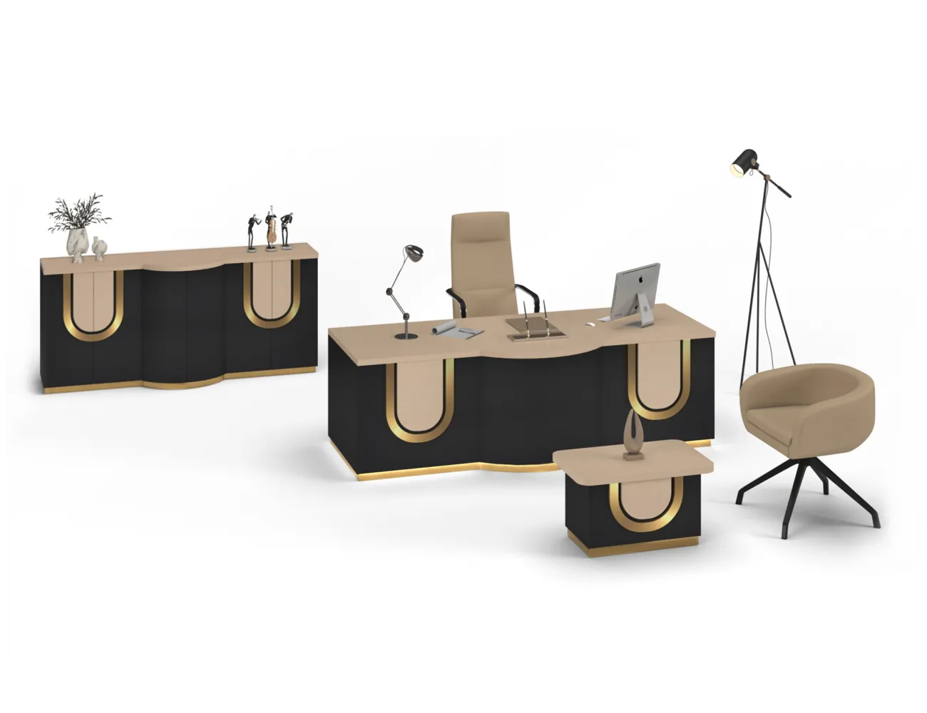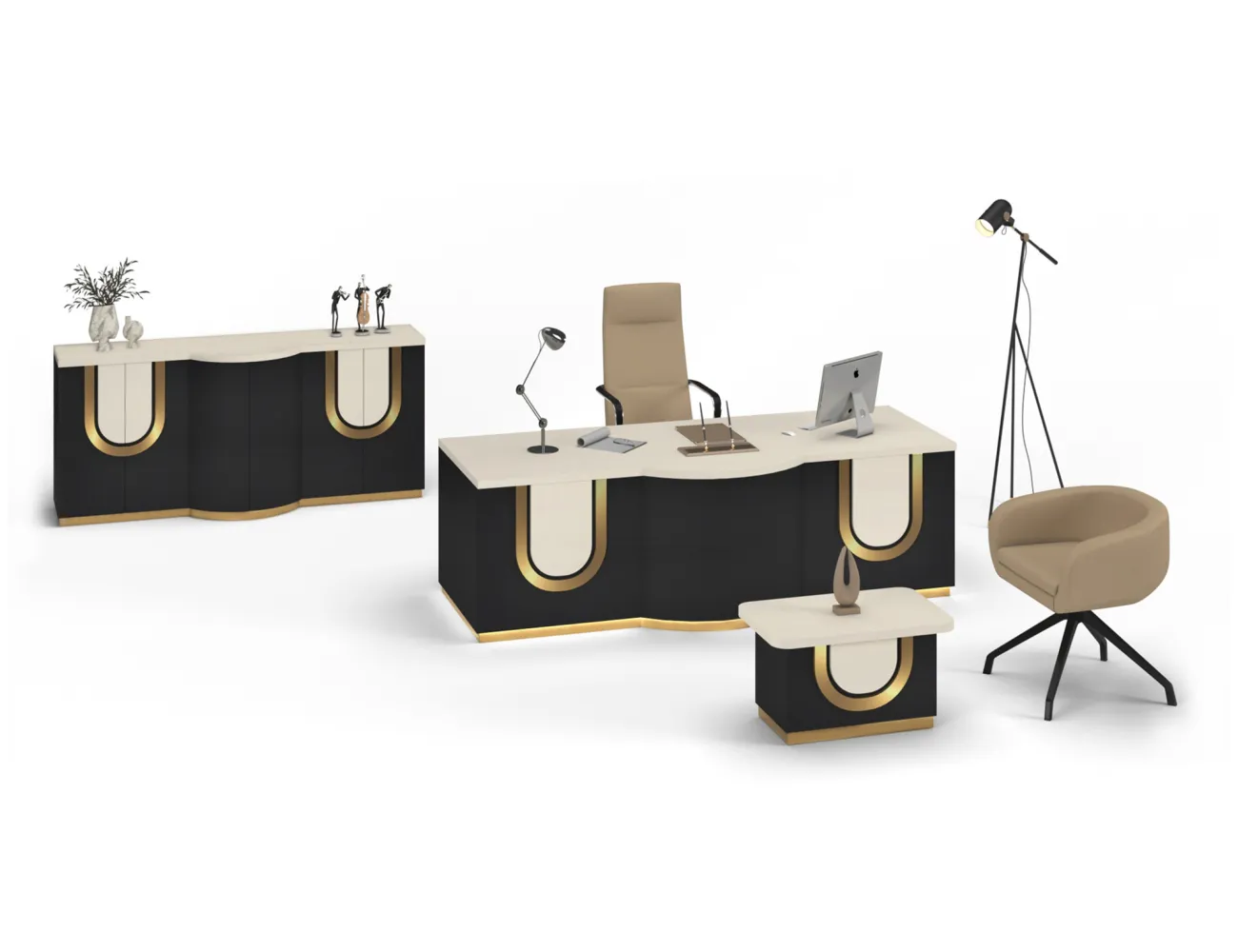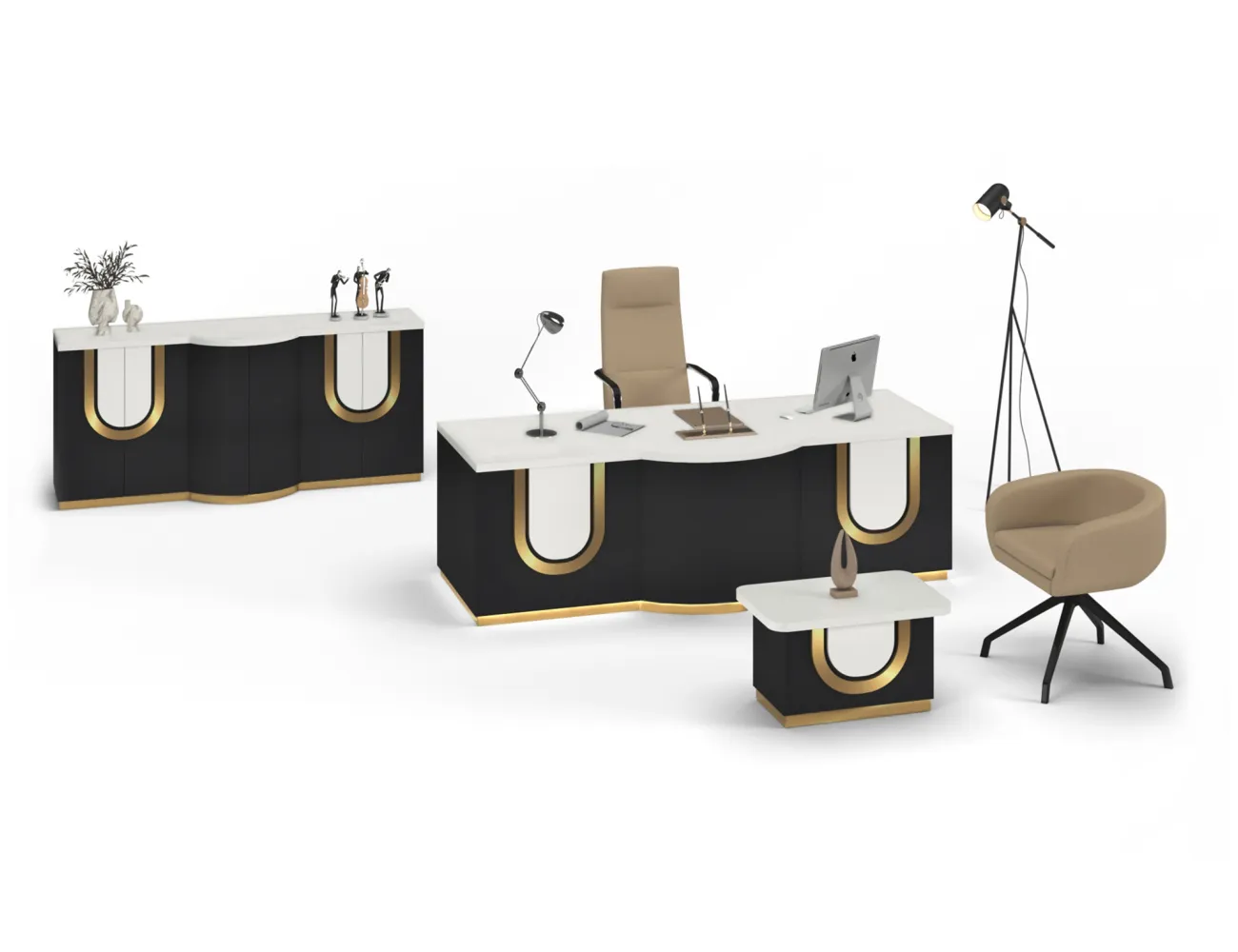 Zarif siyah ve altın detaylarla, Apollon Makam Masası ofisinize prestij katacak!