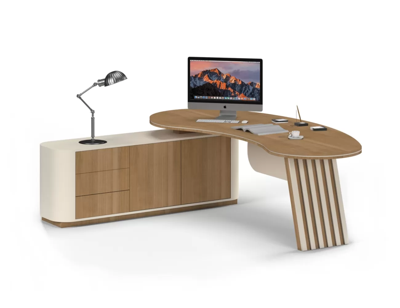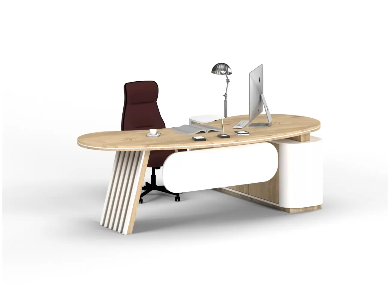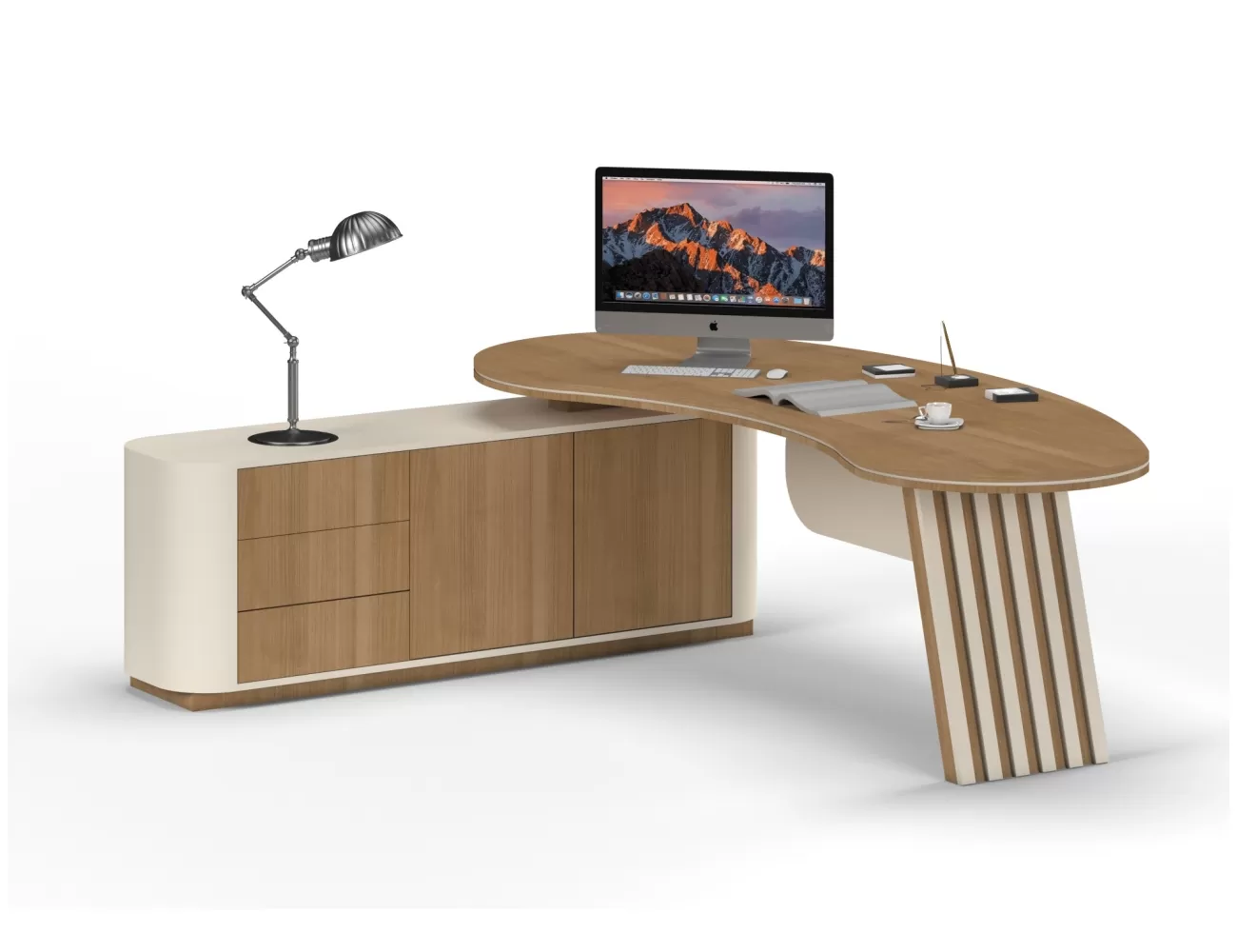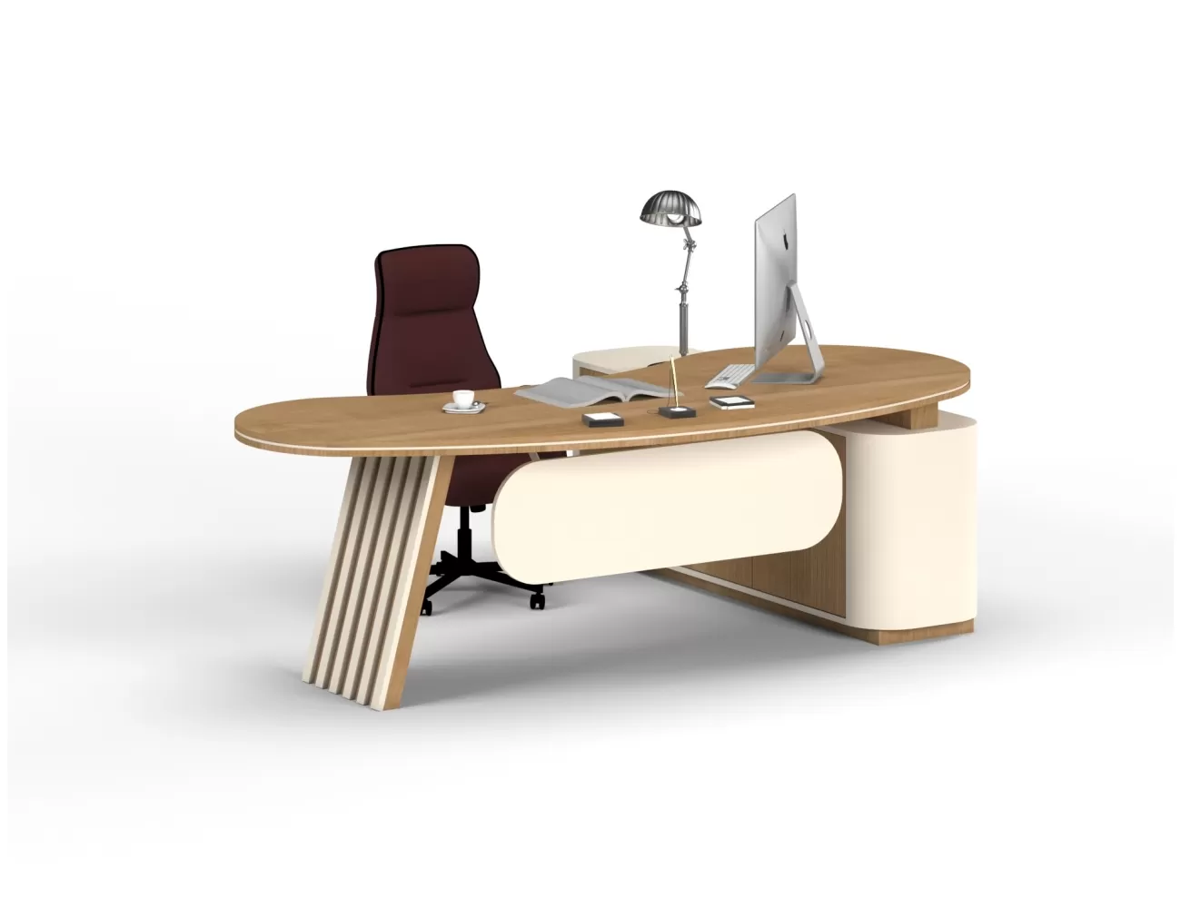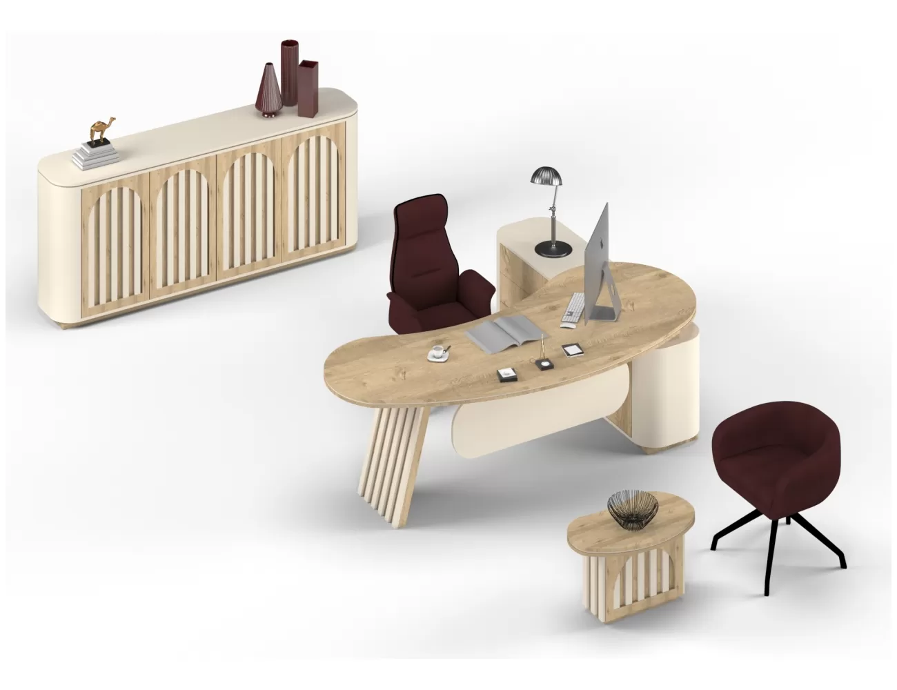 Zarif ahşap detaylar, şık krem yüzeylerle buluşuyor; Victor Makam Masası, ofisinize prestij katıyor!