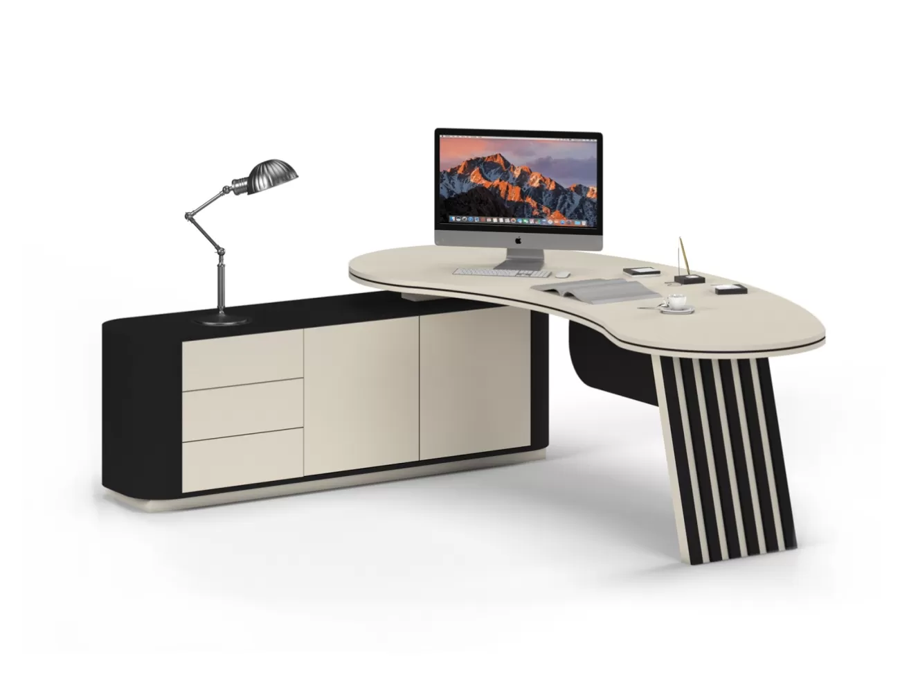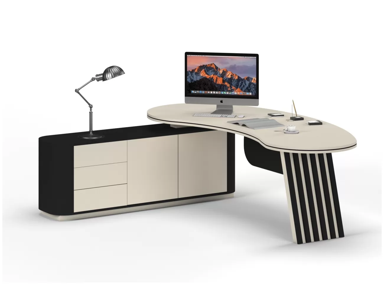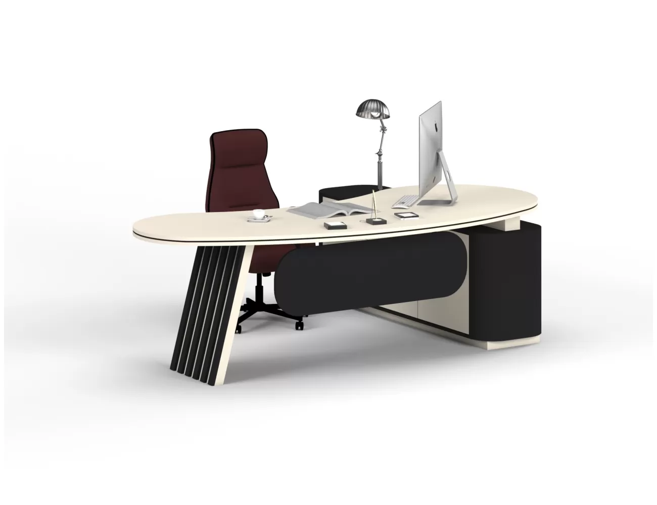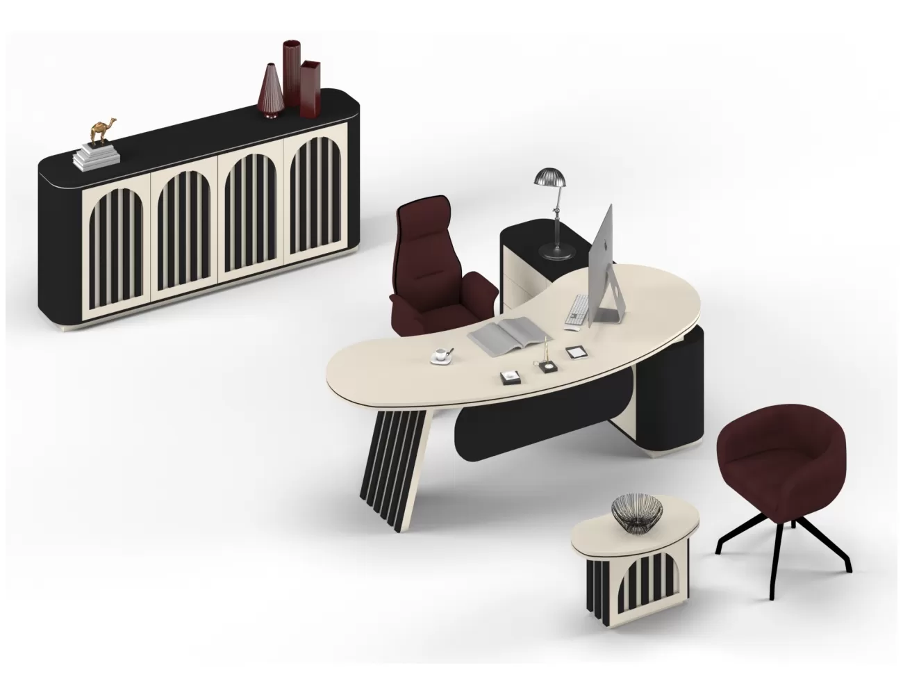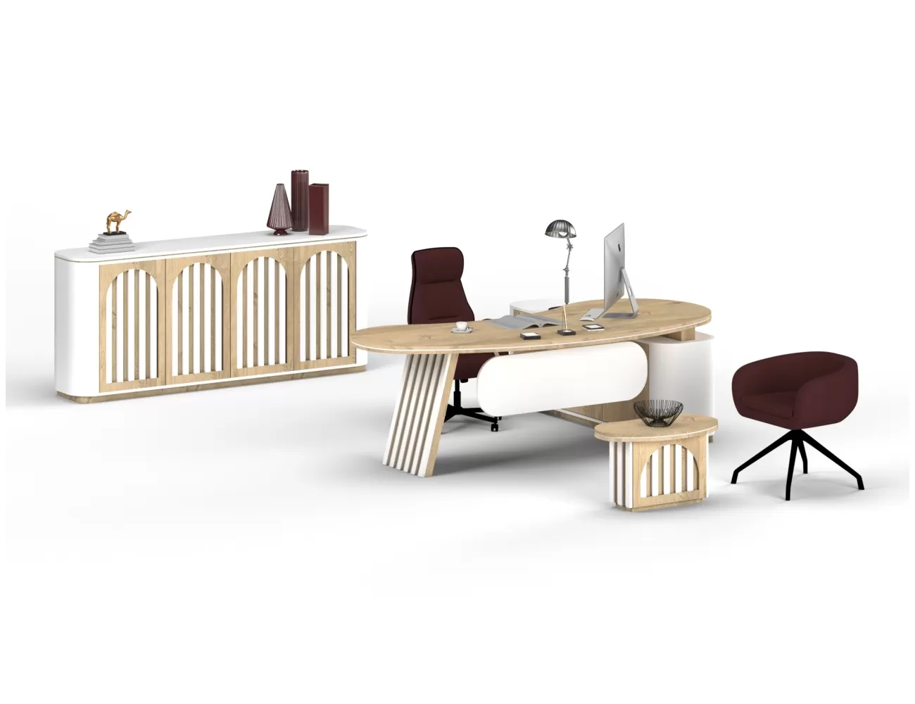 Zarif ahşap detaylar, şık krem yüzeylerle buluşuyor; Victor Makam Masası, ofisinize prestij katıyor!
