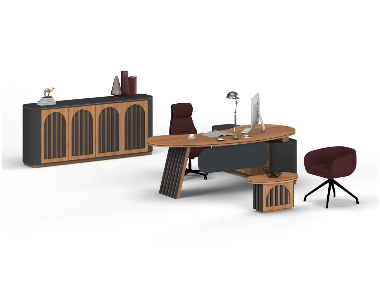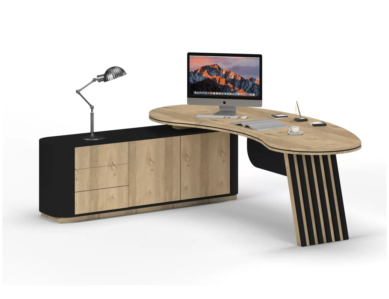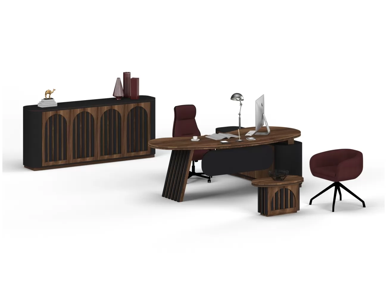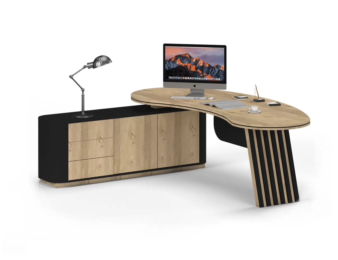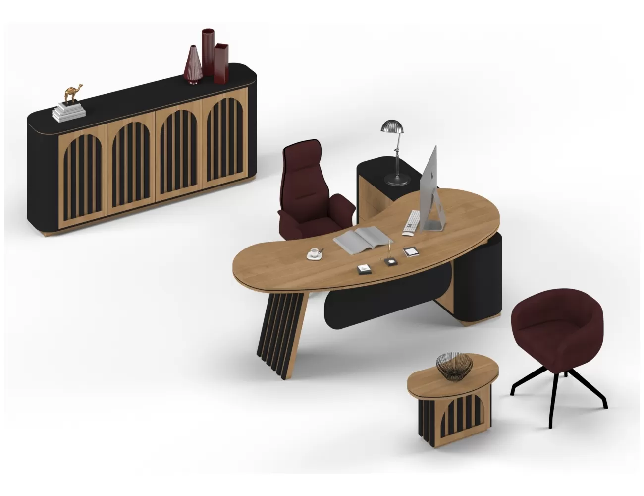 Zarif ahşap detaylar, şık krem yüzeylerle buluşuyor; Victor Makam Masası, ofisinize prestij katıyor!