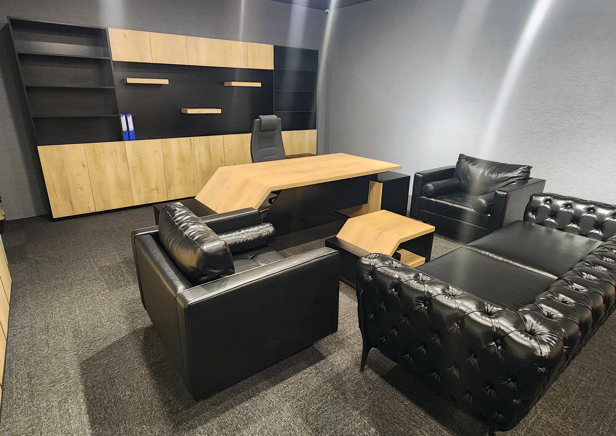 Siyah deri ve ahşabın zarif birleşimiyle ofisinize prestij katın; Orella Makam Masası Takımı sizi bekliyor!